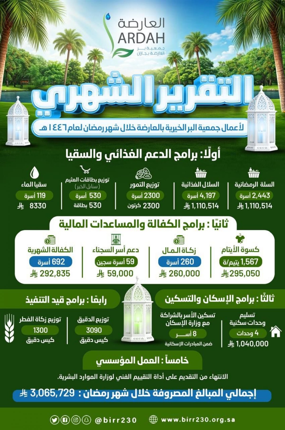 قد سرني مارأيته وما سمعته من نشاط وجهود لهذي الجمعية المباركة (جمعية البر بالعارضة ) وما تقوم به من أعمال نوعة ومميزة لخدمة المستفيدين من أعمالها،وخصوصاً البطاقات الممغنطة للأسر ونحو ذلك من برامج وجهود طيبة تشمل كافة القرى والهجر التابعة للمحافظة. وأوصي الجميع بمد العون لهذي الجمعية بماء يستطيعه مادياً ومعنوياً لمساعدتها على أداء رسالتها الخيرية . وصلى الله وسلم على نبينا محمد .